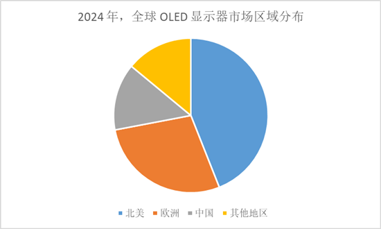 2024 年,全球 OLED 显示器市场区域分布呈现明显分化特征。北美市场凭借品牌商的集中推广,以 44% 的出货占比领跑全球,成为当前最大的 OLED 消费市场;欧洲市场紧随其后,出货占比达 28%,排名第二,这一成绩得益于当地消费者对高品质显示产品的需求及较强的消费能力;中国市场排名第三,市场占比为 14%。尽管中国当前占比低于北美和欧洲,但增长动力强劲,2024 年中国大陆 OLED 面板出货面积约 450 万平方米,同比增长约 47%,增速高于全球平均水平。预计 2025 年中国 OLED 显示面板出货量将达 571 万平方米,在全球 OLED 市场的地位将进一步提升,成为推动全球 OLED 产业发展的重要力量。