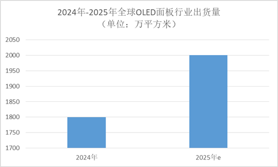 从全球 OLED 面板整体出货情况来看,2024 年全球 OLED 显示面板出货面积跃升至约 1800 万平方米,较上年同比增长 36%,为 OLED 材料市场提供了坚实的需求基础;预计 2025 年全球 OLED 显示面板出货量将超过 2000 万平方米,显示出 OLED 技术在全球范围内的普及程度正不断提高。在细分领域,2024 年全球 OLED 智能手机面板出货量达到 8.5 亿片,同比增长 25.3%,其中柔性 OLED 出货 6.33 亿片,同比增长 19.2%,柔性 OLED 已成为 OLED 行业增长的重要驱动力。2025 年第二季度,全球柔性 OLED 出货量约 1.9 亿片,进一步体现出柔性 OLED 市场的旺盛需求。