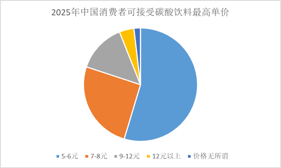 消费者对碳酸饮料价格保持理性敏感,市场已形成以 5-6 元为核心的主流价格带。在可接受的最高单价调查中,5-6 元区间占比 38.69%,3-4 元区间占比 22.62%,7-8 元区间占比 18.03%,9-12 元区间占比 9.84%;3 元以下和 12 元以上的接受度较低,分别为 6.56% 和 2.95%,价格无所谓的消费者仅占 1.31%,极端低价和高价的碳酸饮料市场空间相对有限。