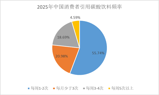 碳酸饮料消费已呈现明显的低频化与节制性特征,消费者普遍将其作为偶尔的享受型选择。数据显示,2025 年消费者饮用碳酸饮料的频率中,“每周 1-2 次” 占比最高,达 55.74%;“每月少于 3 次” 占比 20.98%;“每周 3-4 次” 占比 18.69%;而 “每周 5 次以上” 的占比仅为 4.59%。