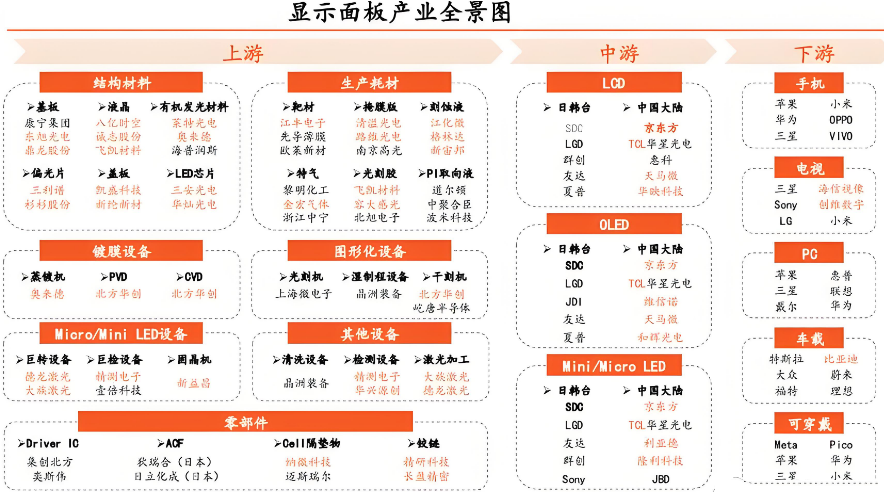 全球液晶面板市场已形成“中国大陆主导产能、韩国专精OLED、日本把控设备材料”的三极格局。中国大陆企业以京东方、TCL华星、惠科等为代表,通过高世代线布局与产能扩张,在LCD领域形成绝对优势,覆盖从电视到车载显示的全场景需求,并通过“面板 + 系统”的垂直整合模式,在商用显示、智能会议等新兴领域快速建立壁垒。韩国企业三星、LG等逐步退出LCD市场,将重心转向OLED技术,三星通过蒸镀工艺优化与柔性基板国产化,推动折叠屏手机、车载柔性显示等高端应用落地;LG则通过增资扩产强化IT领域OLED面板的竞争力,试图在中小尺寸市场开辟新增长极。日本企业虽在面板制造环节逐渐失去优势,但在核心材料和关键设备领域具有不可替代的地位,如康宁、Anvik等企业在玻璃基板、制造装备等方面具有强大的技术实力和市场影响力。