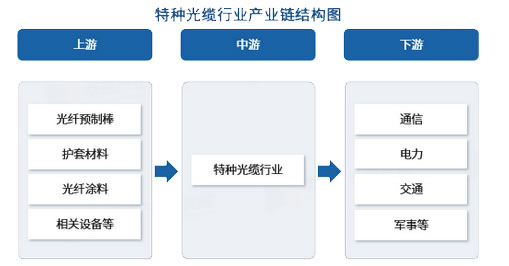 光缆的应用边界不断拓展,从传统通信领域向能源、工业、海洋等多领域渗透,形成 “传统升级 + 新兴爆发” 的需求格局。技术升级驱动光缆从单一传输功能向智能化、高集成化演进,成为提升产品附加值与市场竞争力的核心手段。特种光缆行业产业链上游包括光纤预制棒、护套材料、光纤涂料与相关设备等,上游产业技术密集、资本密集,尤其是光纤预制棒领域,被少数国际巨头所主导。产业链中游为特种光缆的制造与集成环节。产业链下游广泛应用于通信、电力、交通、军事等领域。