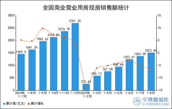 2025年1-8月全国商业营业用房现房销售额(累计值)为1522.45亿元,累计下降6.4%。