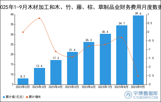 2025年1-9月木材加工和木、竹、藤、棕、草制品业财务费用累计值为39.6亿元。