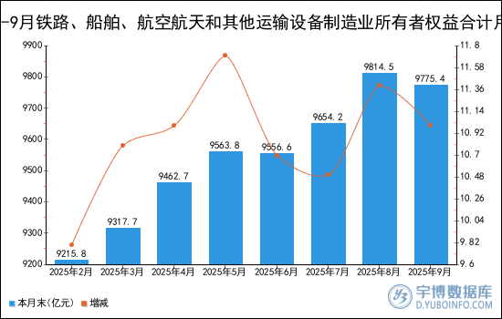 2025年9月铁路、船舶、航空航天和其他运输设备制造业所有者权益合计本月末为9775.4亿元,增减11%。