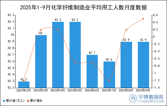 2025年1-9月化学纤维制造业平均用工人数累计值为42.9万人,累计增长0.5%。