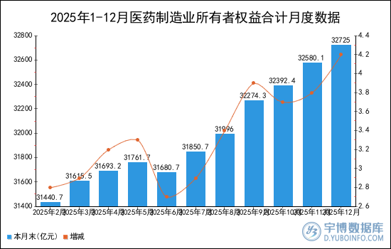 2025年12月医药制造业所有者权益合计本月末为32725亿元,增减4.2%。